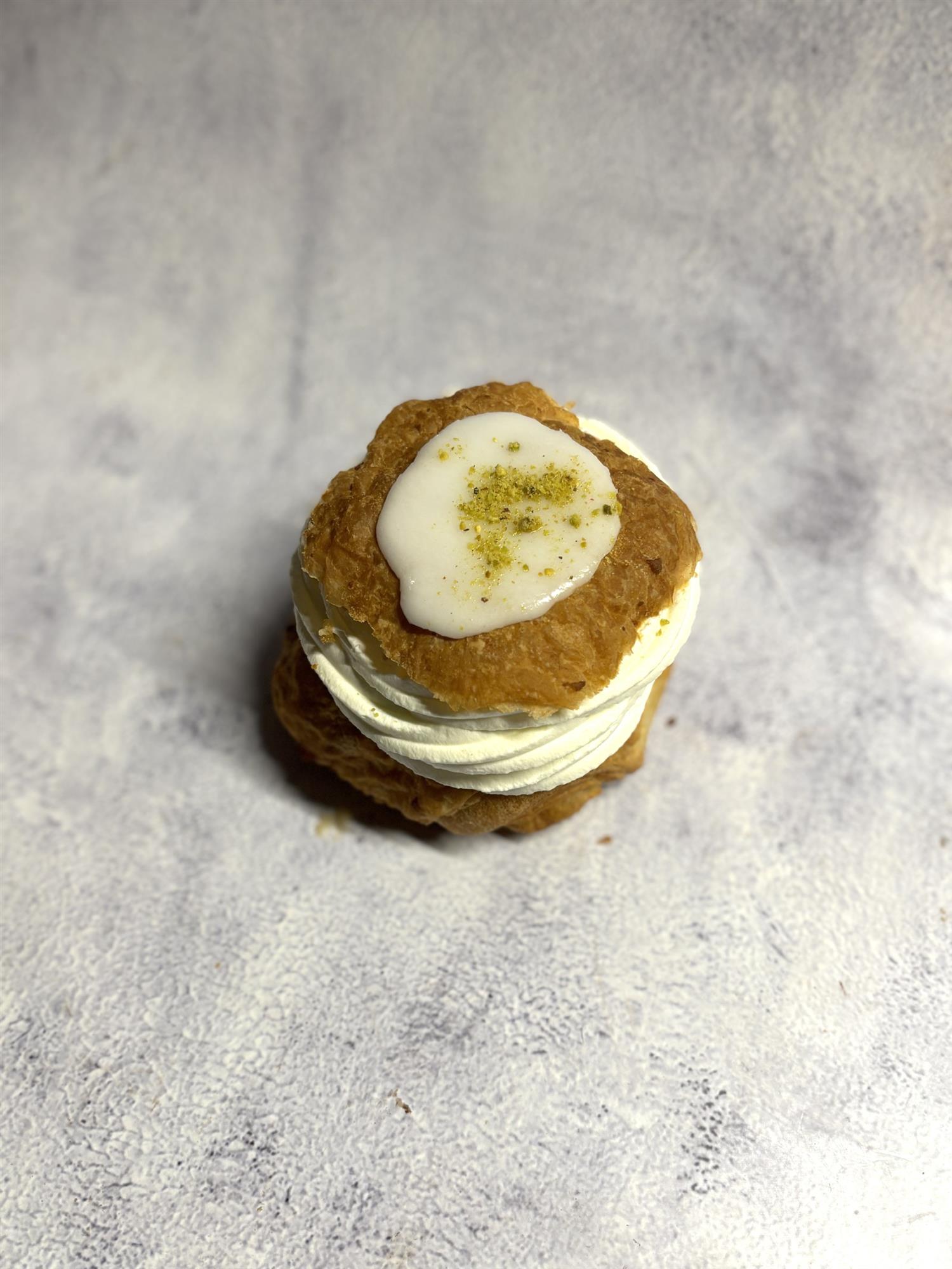 Wienerbrødsbolle, æblekompot, fløde, creme, makroner og glasur