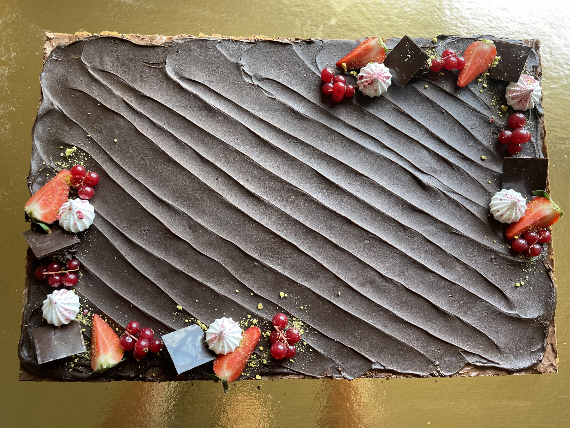 Lækker brownie med chokoladeganache på toppen, pyntet med frisk frugt og chokolade.