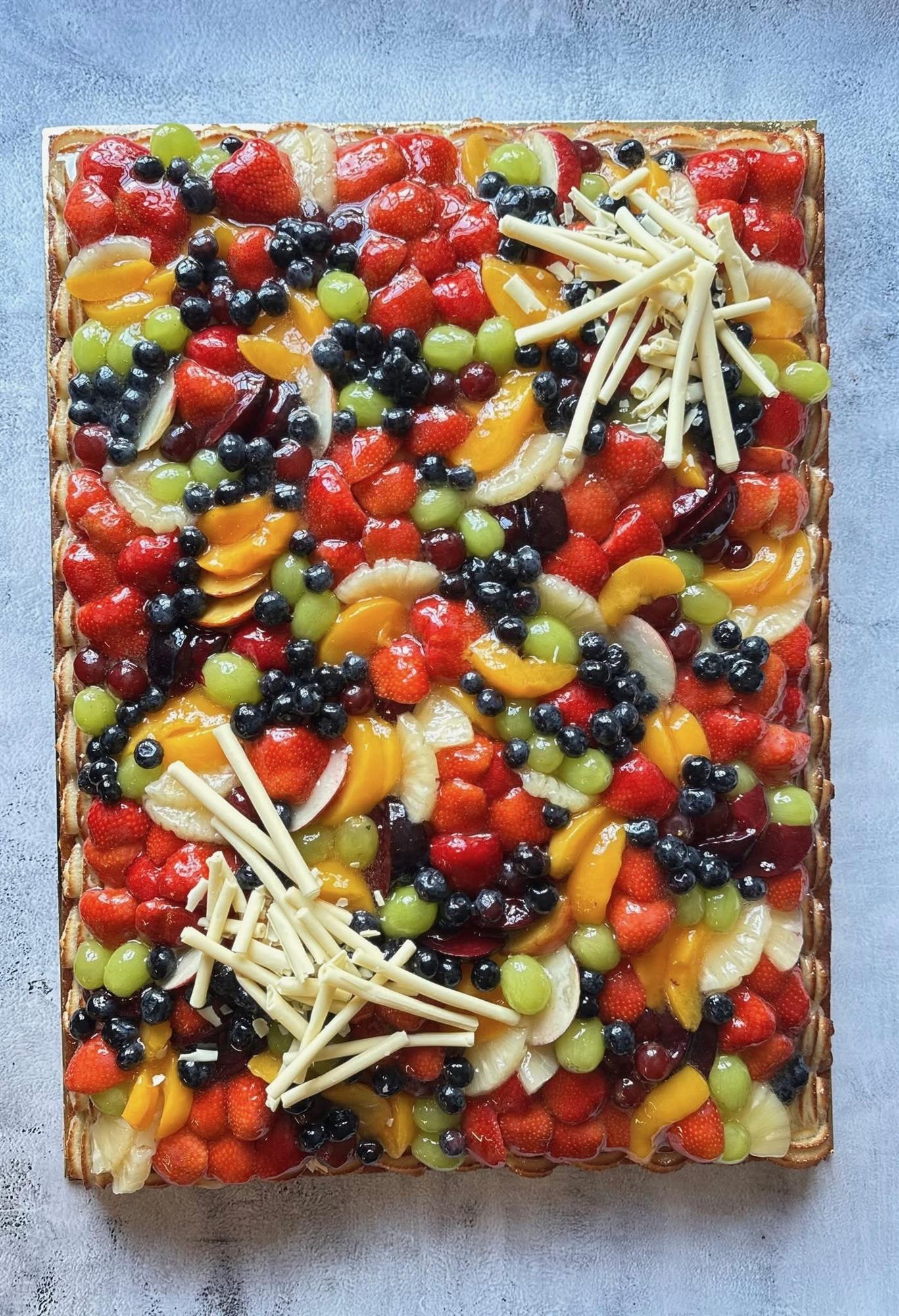 Indeholder linsedejsbund, mazarin masse, kransekagekant, flødecreme, frugt på toppen.