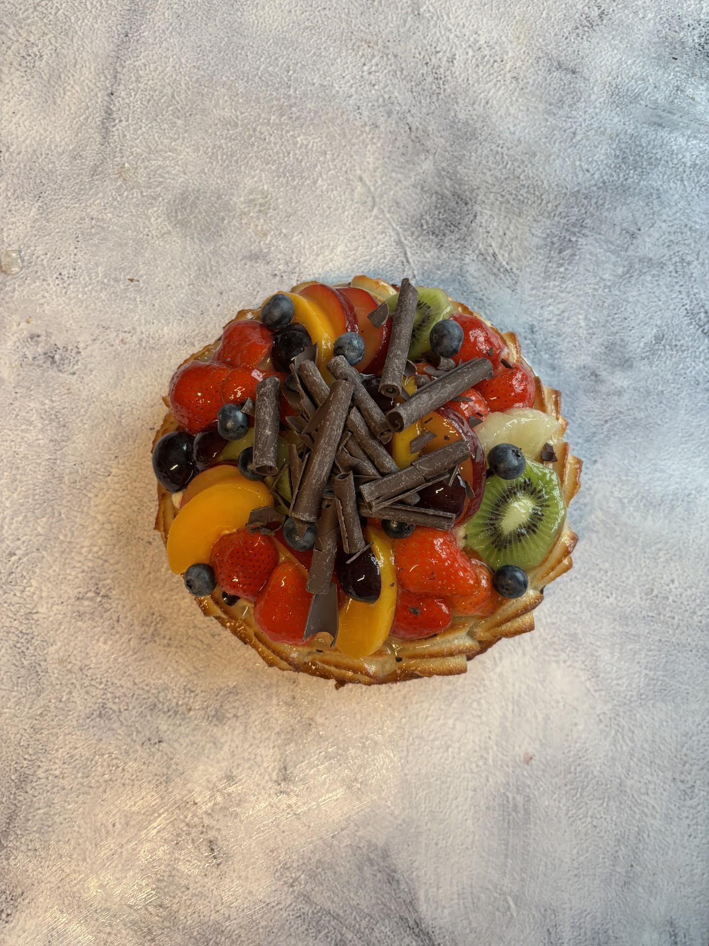 mazarinbund med chokolade, kransekagekant, flødecreme og årstidens frugter