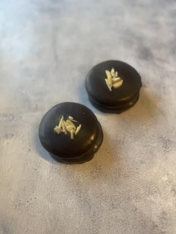 Hjemmelavet honningkage med en blød smørecreme og abrikosmarmelade, dyppet i mørk chokolade og mandelsplitter