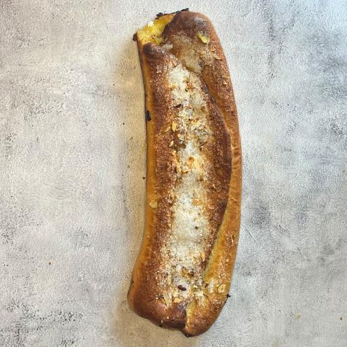 Lækker sprød gærdej, lagt sammen med creme og chokoladestykker. Toppet med perlesukker og nødder.