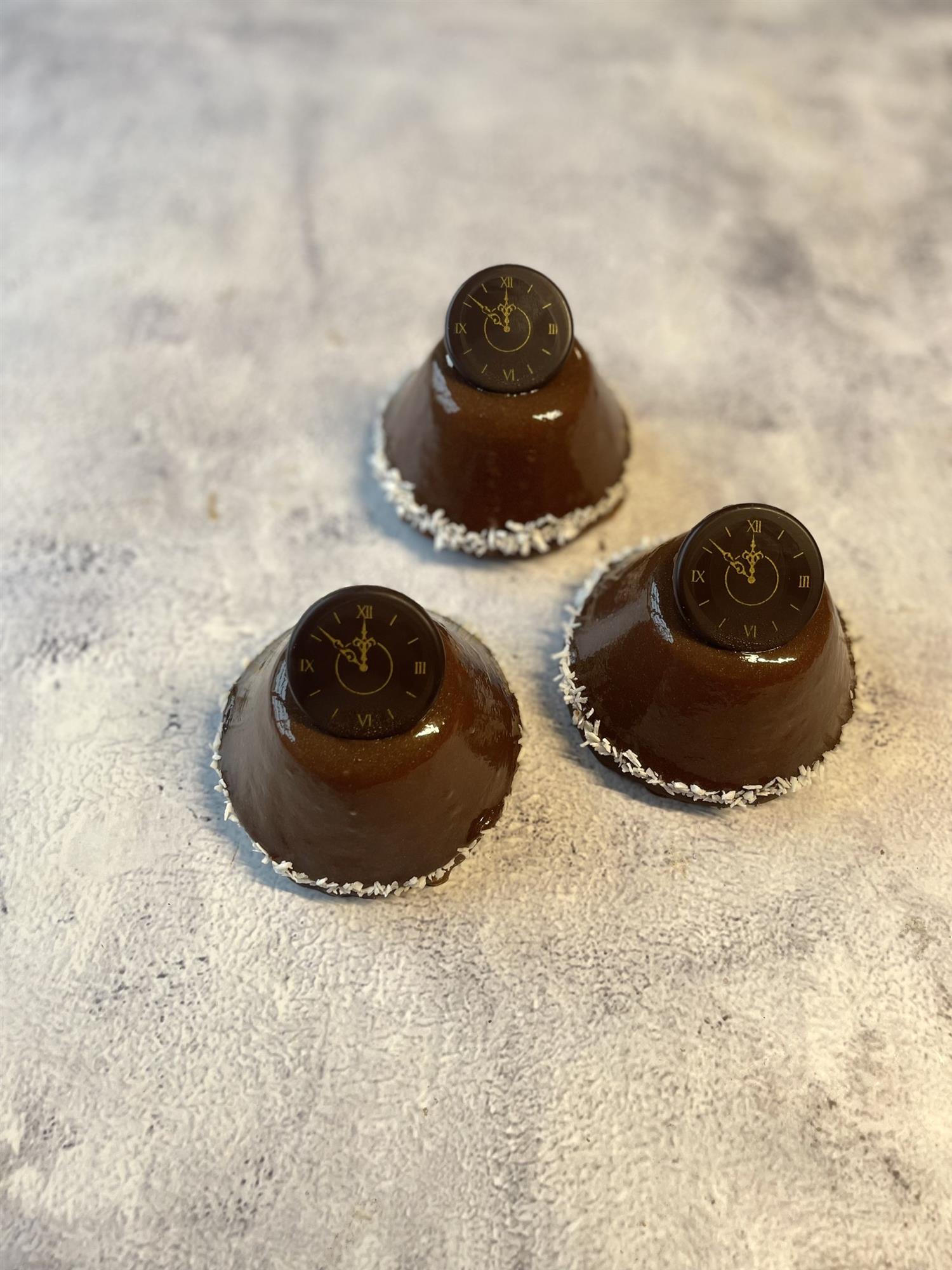 Chokolade mousse med passion indlæg, på bund af kransekage og linsedej overtrukket med lys chokolade og nødder. Afsluttet med glimmer glaze.