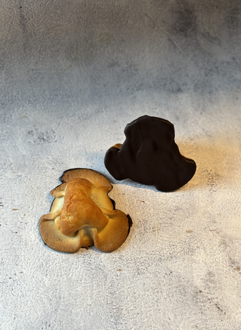 Indeholder en sprød linsedej og kransekage dyppet i mørk chokolade.